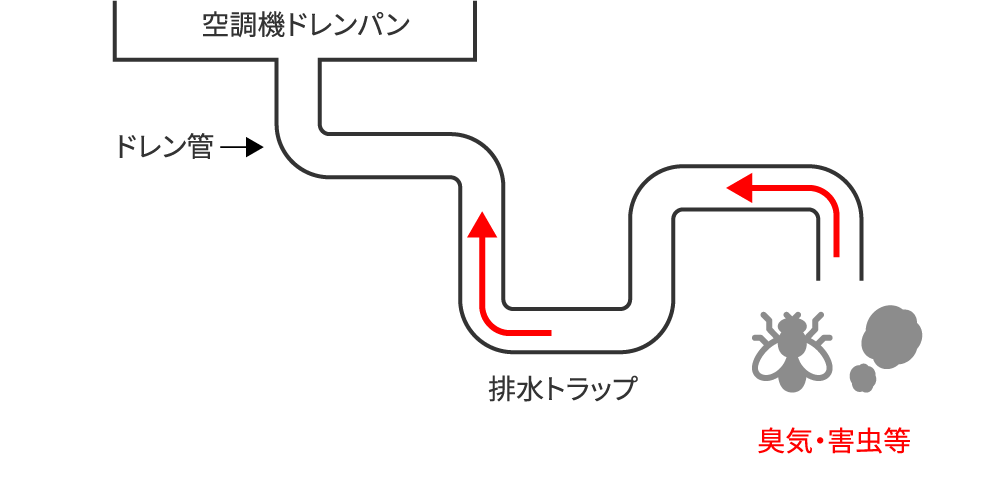 トラップがないと、空調機のドレン管を通じて、汚染空気や害虫、臭気の逆流の恐れがあり、居室内の衛生環境が保てなくなります。